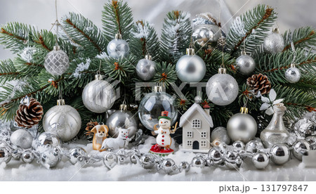 A cozy Christmas arrangement with a tree decorated with snow and shiny balls.