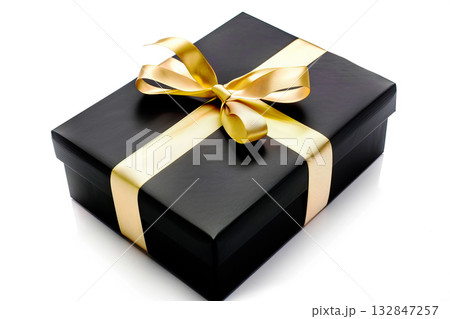 Black gift box with a golden bow on a white background. Holiday concept, christmas, birthday, sale, marketing.