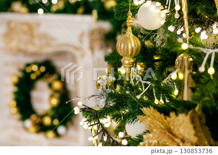 Gold and silver Christmas toys, balls and garlands on a spruce branch on christmas tree against the background of a fireplace with a fir wreath