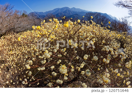 丹沢山地・権現山稜線のミツマタ群落と檜洞丸の眺め