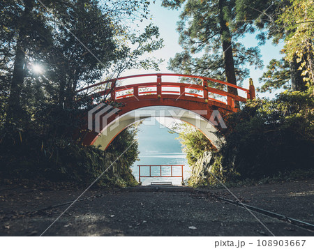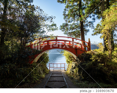 神奈川県足柄下郡箱根町元箱根にある箱根神社の湖水祭りに使われる船庫前の太鼓橋と芦ノ湖