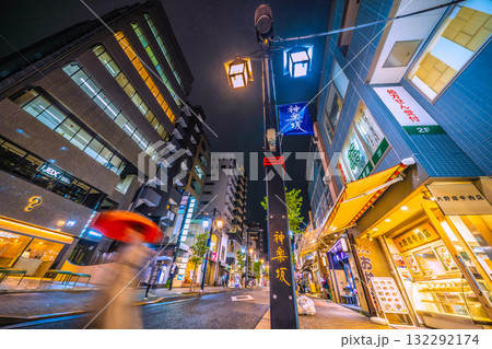 日本の東京都市景観 情緒漂う街。情緒あふれる夜の神楽坂などを望む。奥は神楽坂上