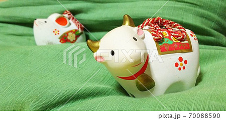 手前に新年の丑の土鈴、遠くに旧年の鼠の土鈴、モスグリーン背景