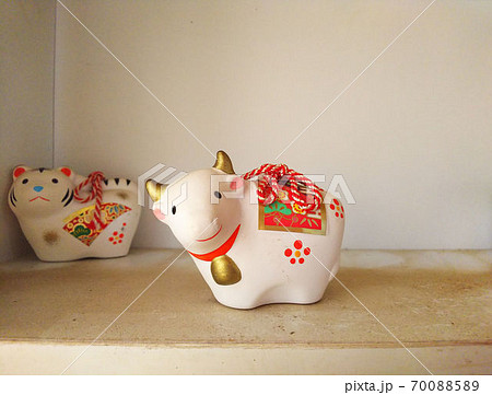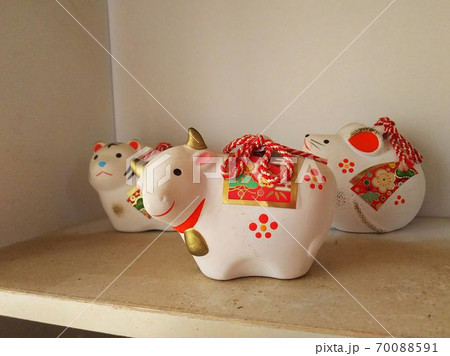白い棚の上に丑年の置物と鼠年の置物、寅年の置物