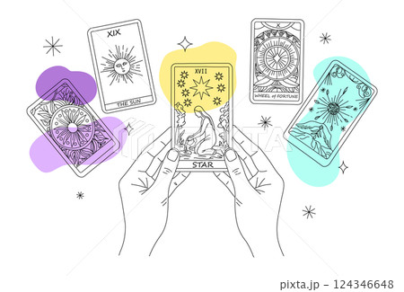 タロットカードのシンプルな線画イラスト,手に持つ星のカードと占い