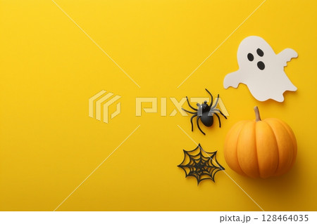 Halloween background, yellow background, top view, Halloween pumpkin, ghost paper cutout, spider.