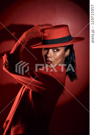 Fashion, spotlight and model with red suit, luxury clothes or designer brand apparel for aesthetic 90s style on studio background. Mystery, dark beauty or retro black woman with creative shadow light