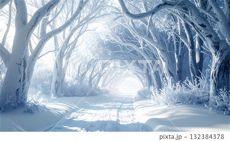 眩い光に包まれた冬の並木道、霧氷が輝く木々が続く幻想的な雪の風景。