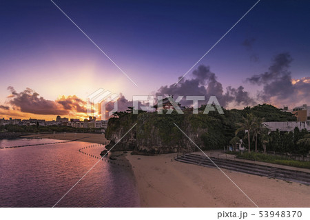 沖縄の那覇の市にある波の上ビーチと崖の上から海と日の出を見下ろす波上宮