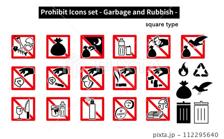 ゴミに関連する「禁止」「注意」「警告」のアイコンセット