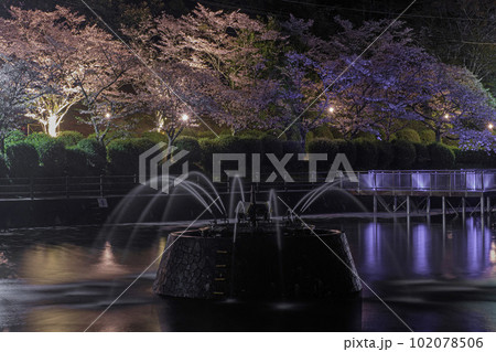 甘木公園の噴水と夜桜