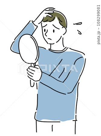 鏡を見ながら髪を気にする男性シンプル線画