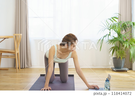 オンラインヨガサロンを自宅で受講してポーズをする若い女性