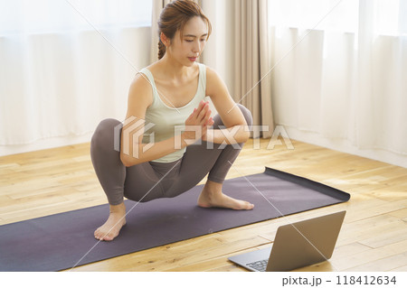 オンラインヨガサロン配信でポーズを見せる若い女性