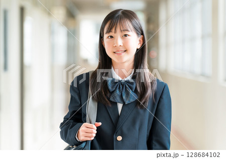 学校の廊下を歩く制服姿の小学生,中学生,高校生の女子生徒