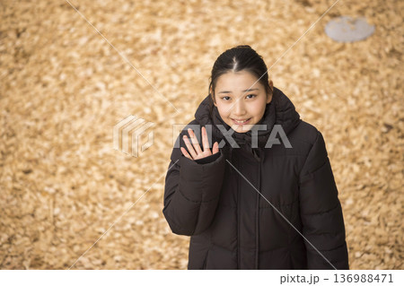 ウッドチップが敷き詰められた公園に立つ冬服の女性