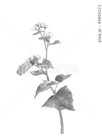 水彩で描いたソバの花の水墨画風モノトーンのイラスト 白バック 透過背景