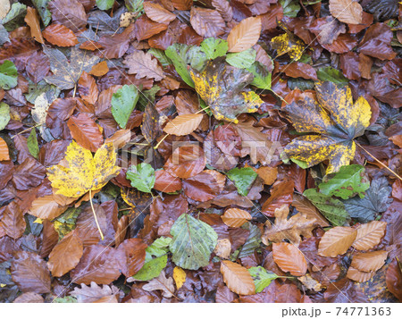 colorful autumn fallen wet beech, maple, oak and birch tree leaves on forest ground. Seasonal natural background