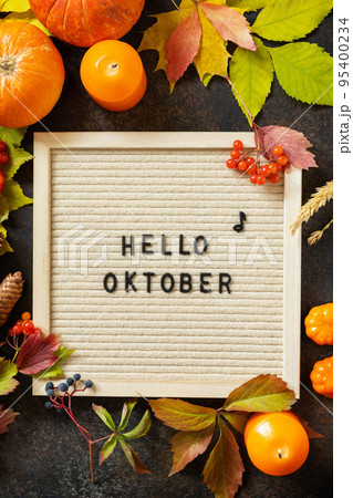 Autumn background with Hello October letters and autumn message board, pumpkins and colorful leaves. Cozy autumn mood. Fall seasons greeting card.