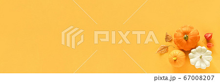Thanksgiving day or Halloween concept banner. Top view white background decor from pumpkin, red berry, green leaves with copy space. autumn and fall season background.