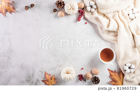 Autumn composition. Pumpkin, cotton flowers, autumn leaves and sweater on stone background. Flat lay, top view with copy space.