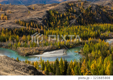 Scenic autumn landscape with a winding river through colorful forested valley