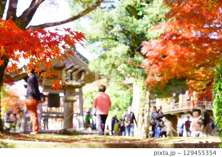犬山寂光院 鐘楼堂と紅葉の中を歩く観光客