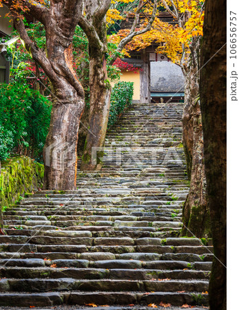 秋の寂光院 紅葉に包まれた山門と石段の参道(京都府京都市左京区大原)