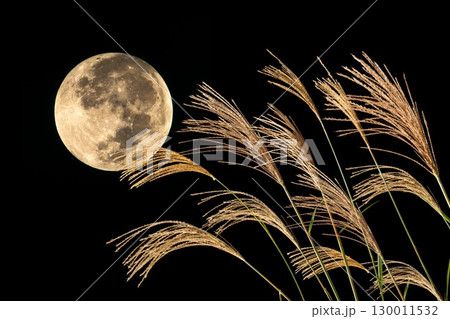中秋の名月 十五夜 ススキと満月 イメージ素材