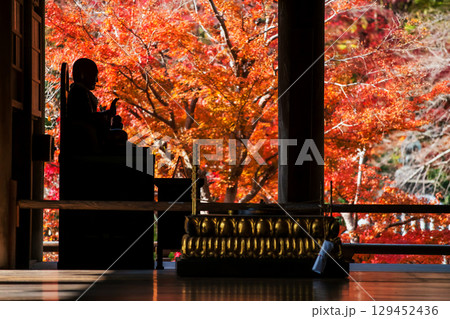 Silhouette Buddha statue in Hasedera temple hall at fall, Nara