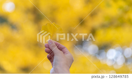 黄色に色づいたイチョウの水彩イラスト。風で散る落ち葉(実付き)。秋の自然素材。