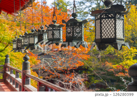 奈良 談山神社拝殿の釣り灯籠と紅葉