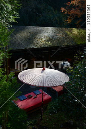 秋の京都高雄 神護寺参道 硯石亭 腰掛けと野点傘