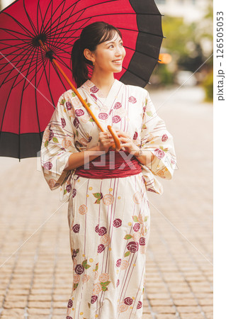 雨の中秋の温泉街を歩く浴衣姿の若い女性【撮影協力・新発田市フィルムコミッション協議会】