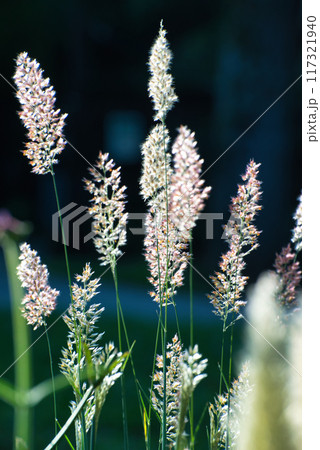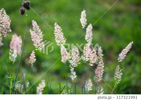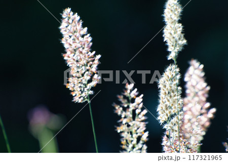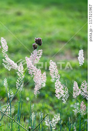 朝日に輝くメリニス サバンナのピンクの花穂の風景