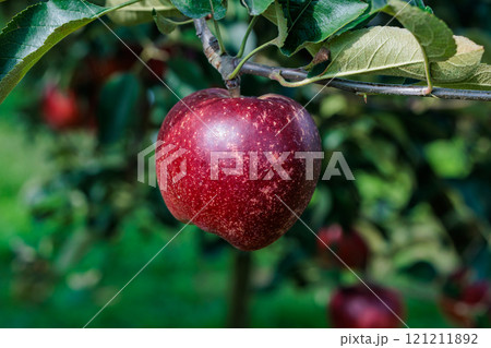 果樹園の美味しいリンゴ品種の秋映(あきばえ)