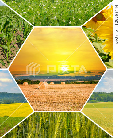Agricultural fields and blue sky. Photo collage. Vertical photo