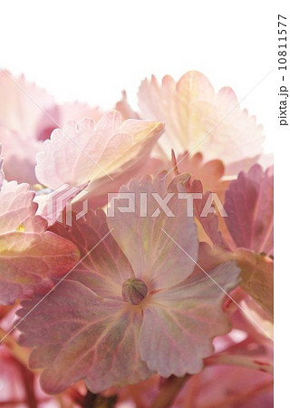 秋の背景素材・アキイロアジサイの萼片の花と葉・白バック縦位置