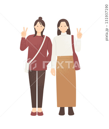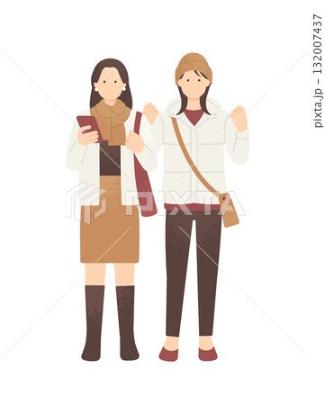 旅行先でSNS用に写真を撮る女性二人組 秋冬ファッションの女の子ベクター素材