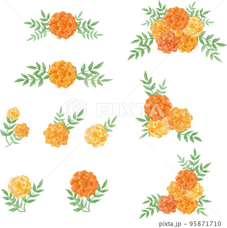 マリーゴールドの花の装飾セット 水彩イラスト素材