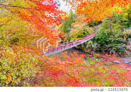 東京 紅葉に染まる秋川渓谷 石舟橋