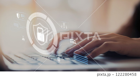 Cybersecurity and Data Protection Technology Concept. Hands typing on a laptop with a padlock icon and security symbols, representing data protection, cyber security, and secure online communication.