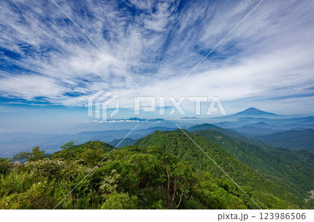 丹沢山地・塔ノ岳から新緑の山並みと富士山