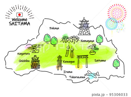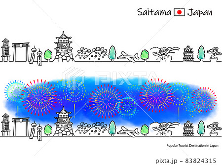 埼玉県の観光地の街並みと花火のシンプル線画セット