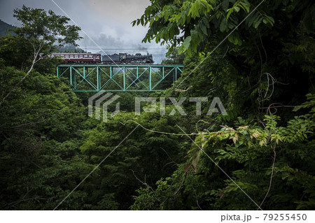 緑に囲まれた渓谷を煙を吐きながら疾走る蒸気機関車が鉄橋に差しかかる