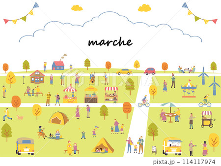 マルシェ・マーケットの手描き風イラストのセット 市場 イベント バザー 飾り フェス フリマ リボン