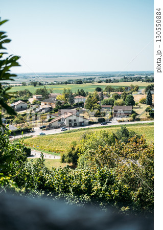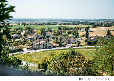 Scenic view of a rural French village surrounded by farmland and greenery under a clear sky. Return to the countryside, neo-ruralism, remote work migration, slow living