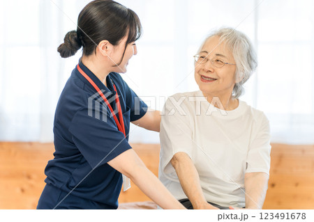 老人ホーム・介護施設にいるシニア女性と介護士・ケアマネージャーの女性スタッフ