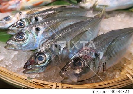 魚市場で売られている新鮮なアジ画像