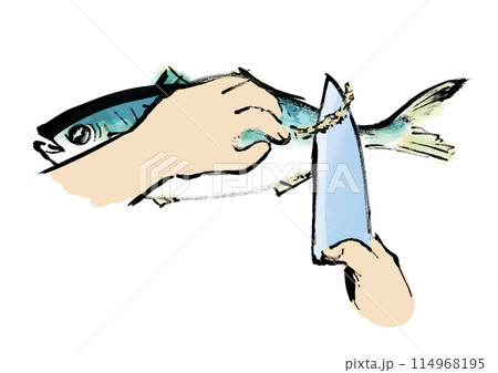 魚(鯵)のぜいごを取っている和風手書きイラスト